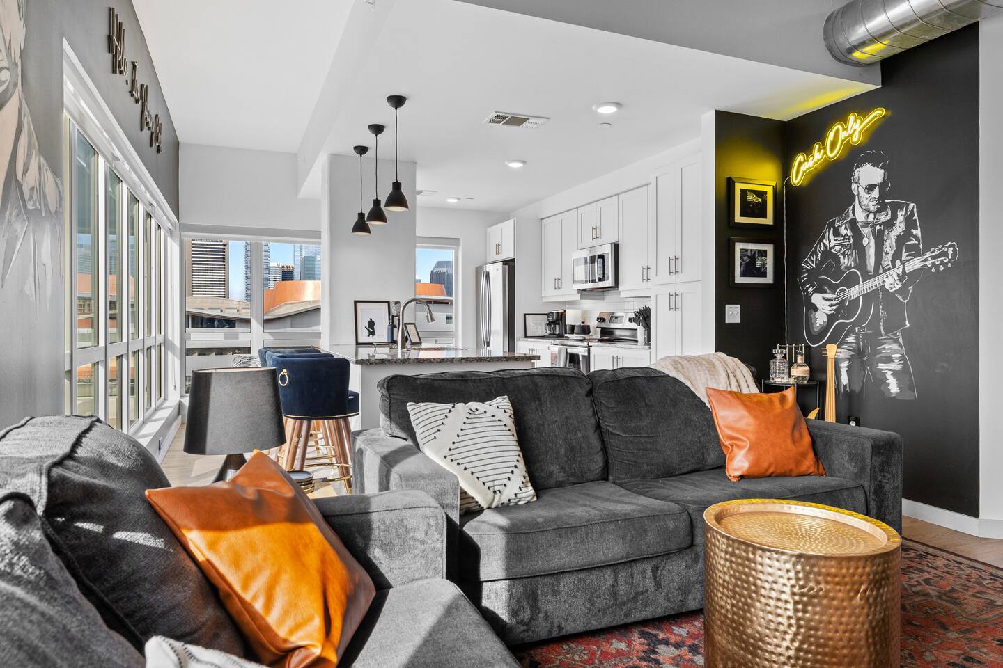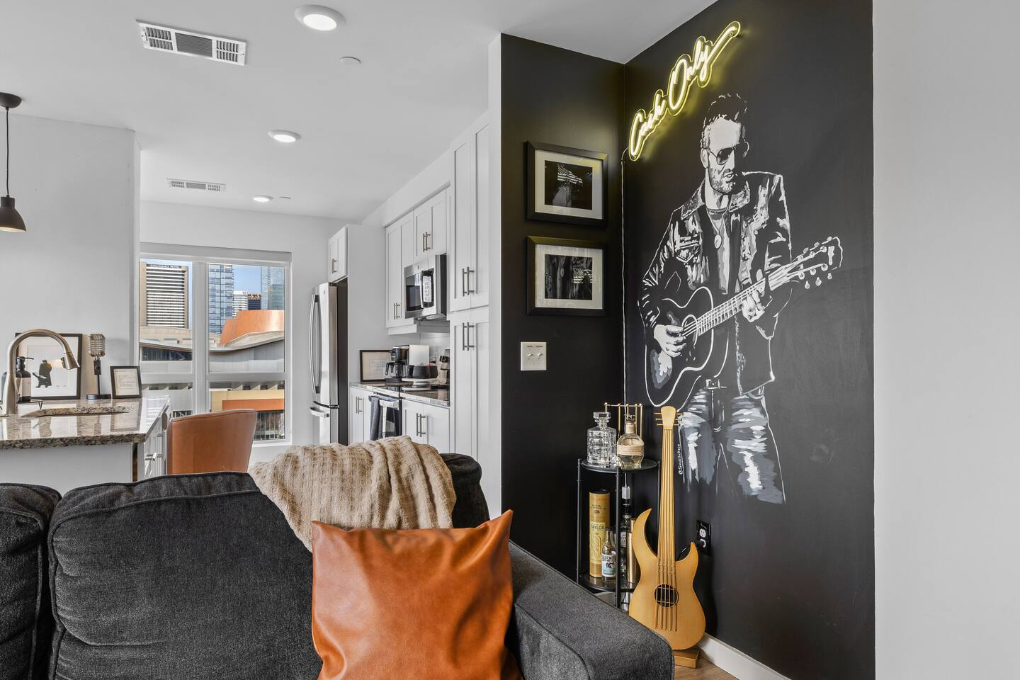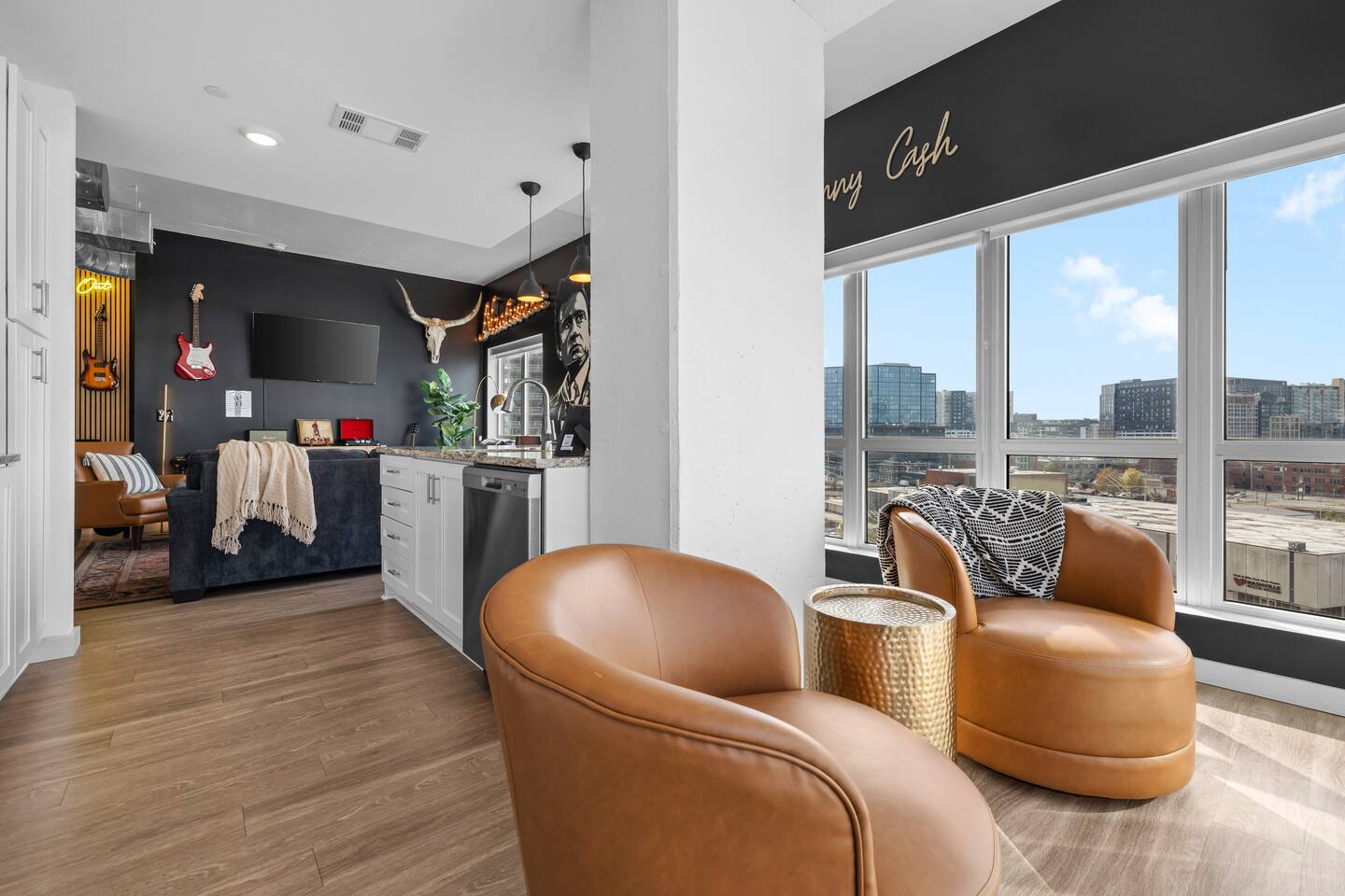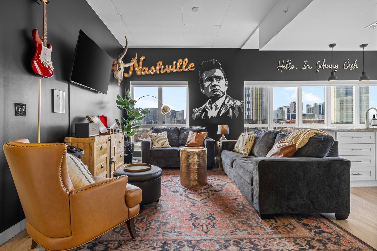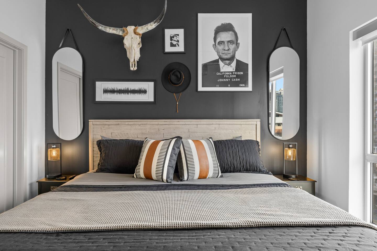 From the moment you walk in, you’ll feel the soul of Cash’s music woven into every detail. The living space features warm textures, rustic-modern accents, vintage touches, and Johnny Cash–inspired décor that sets the tone for your Nashville escape. Spin records on the Victrola, connect to the Marshall Bluetooth speaker, or simply unwind as the city lights glow through the floor-to-ceiling windows.