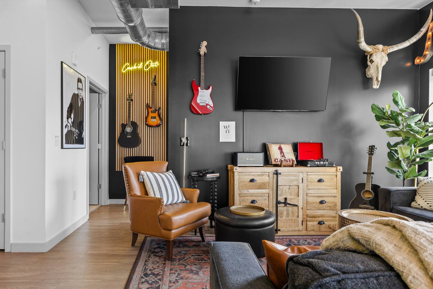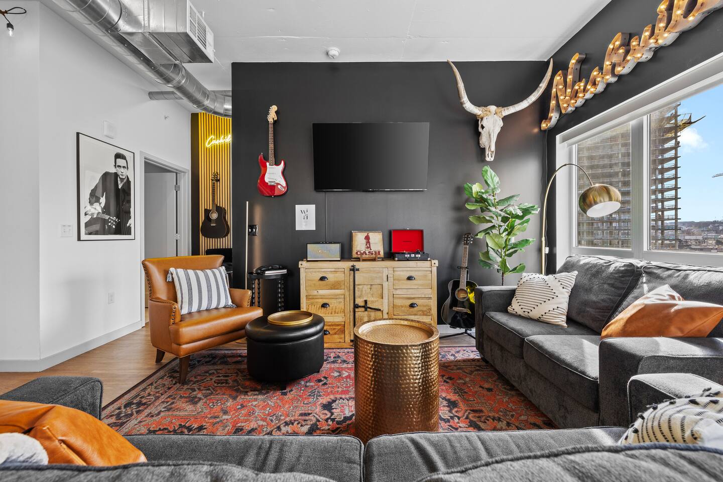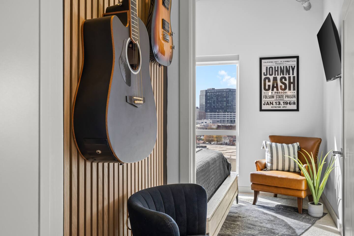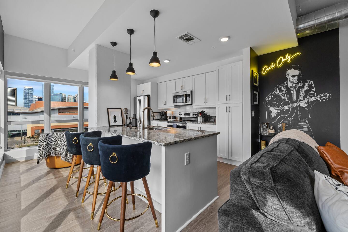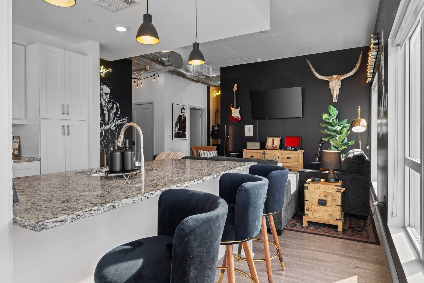From the moment you walk in, you’ll feel the soul of Cash’s music woven into every detail. The living space features warm textures, rustic-modern accents, vintage touches, and Johnny Cash–inspired décor that sets the tone for your Nashville escape. Spin records on the Victrola, connect to the Marshall Bluetooth speaker, or simply unwind as the city lights glow through the floor-to-ceiling windows.