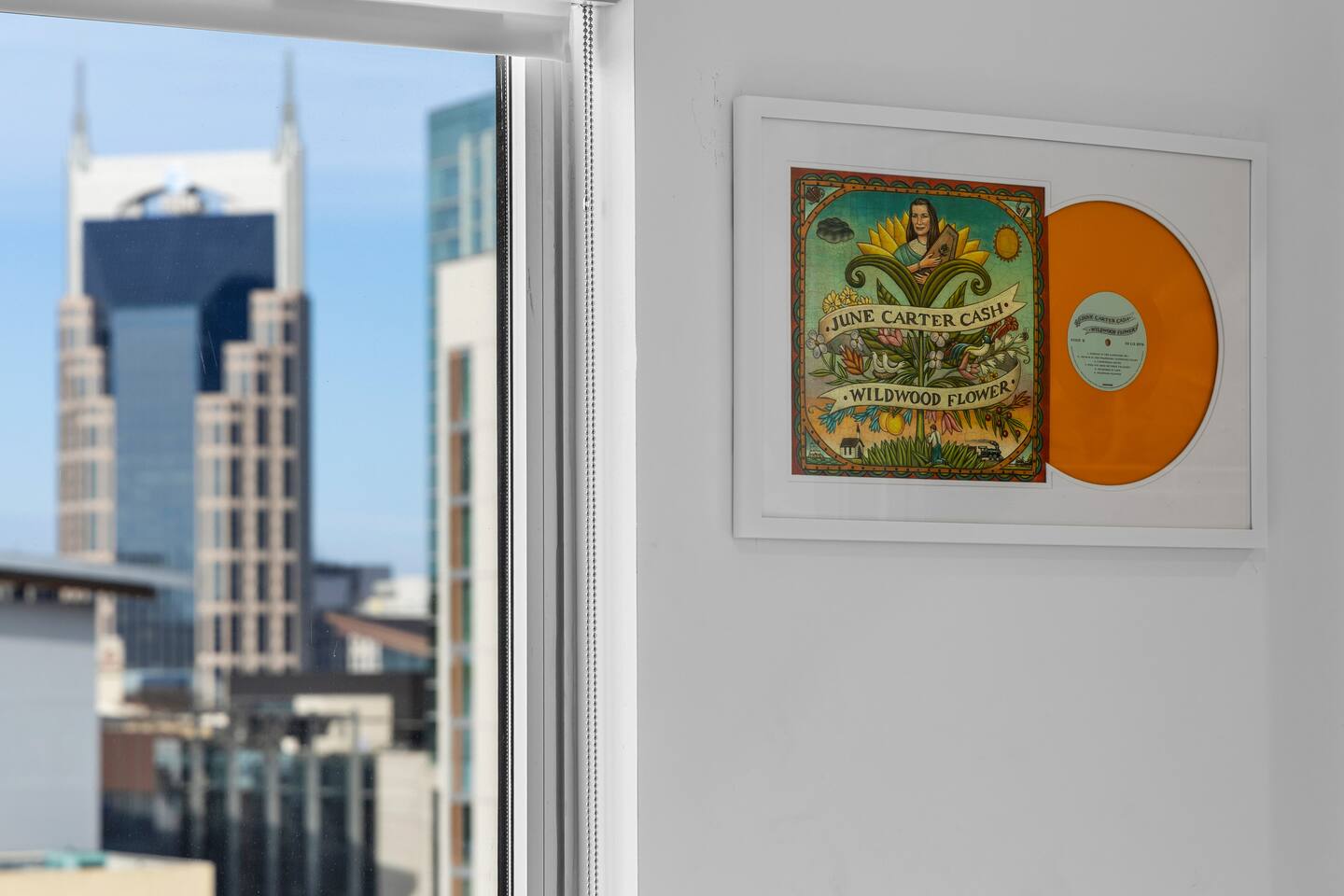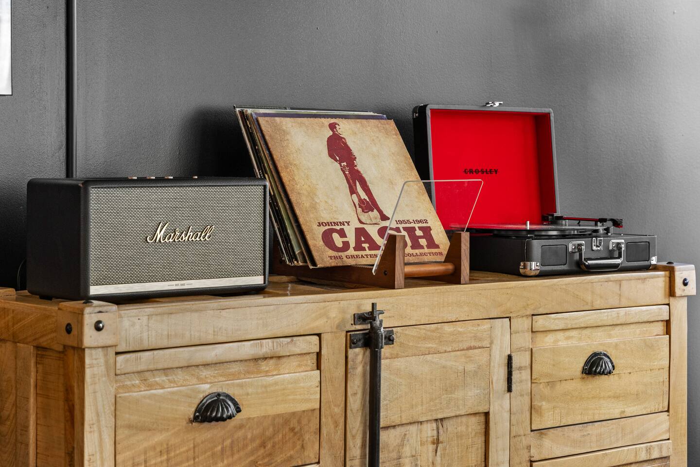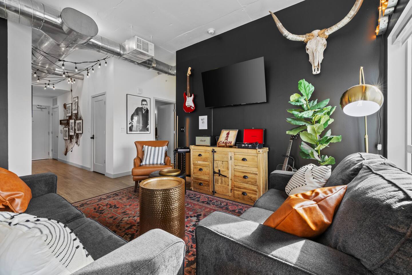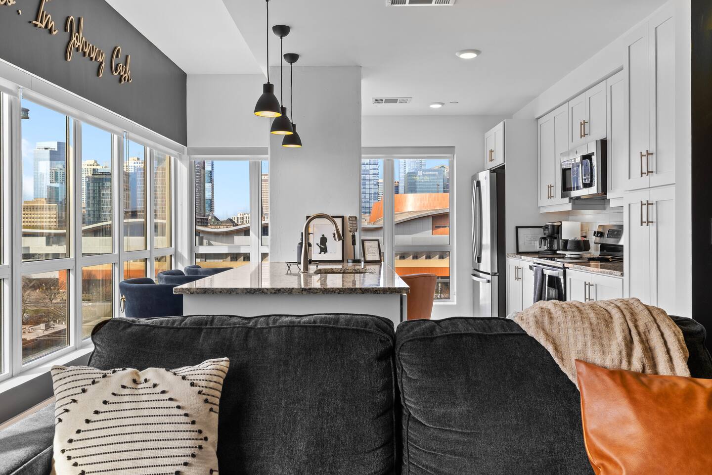 From the moment you walk in, you’ll feel the soul of Cash’s music woven into every detail. The living space features warm textures, rustic-modern accents, vintage touches, and Johnny Cash–inspired décor that sets the tone for your Nashville escape. Spin records on the Victrola, connect to the Marshall Bluetooth speaker, or simply unwind as the city lights glow through the floor-to-ceiling windows.