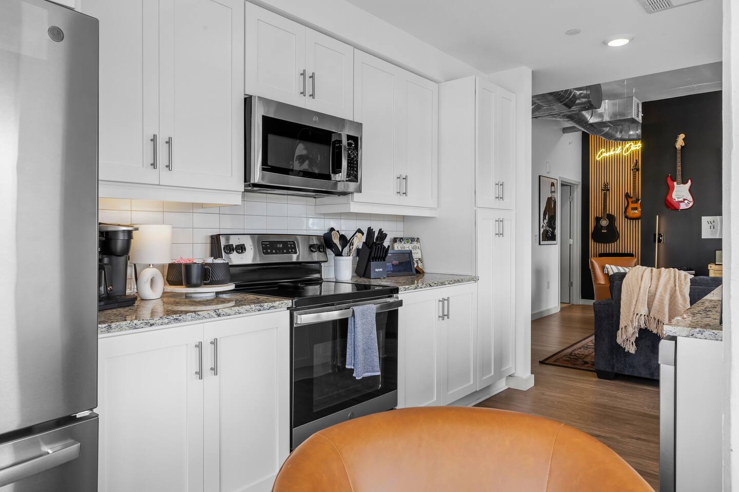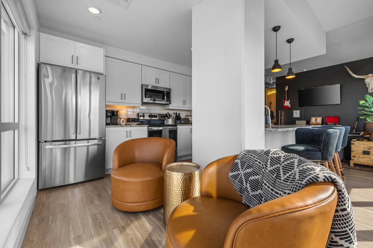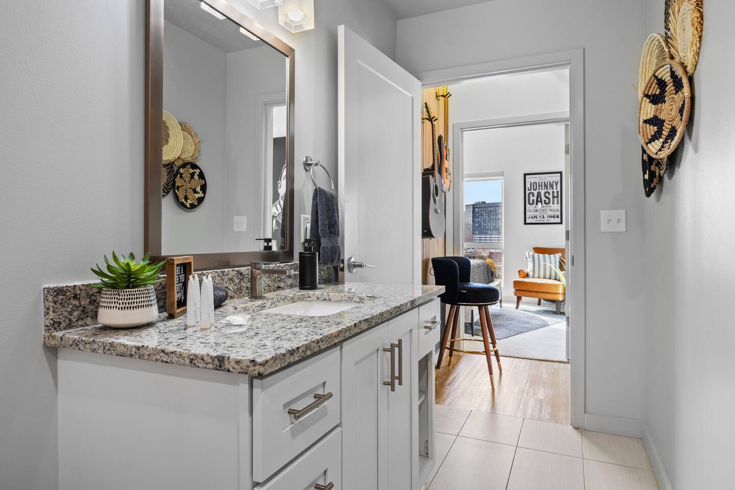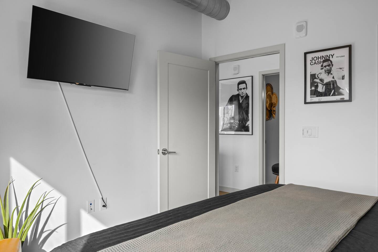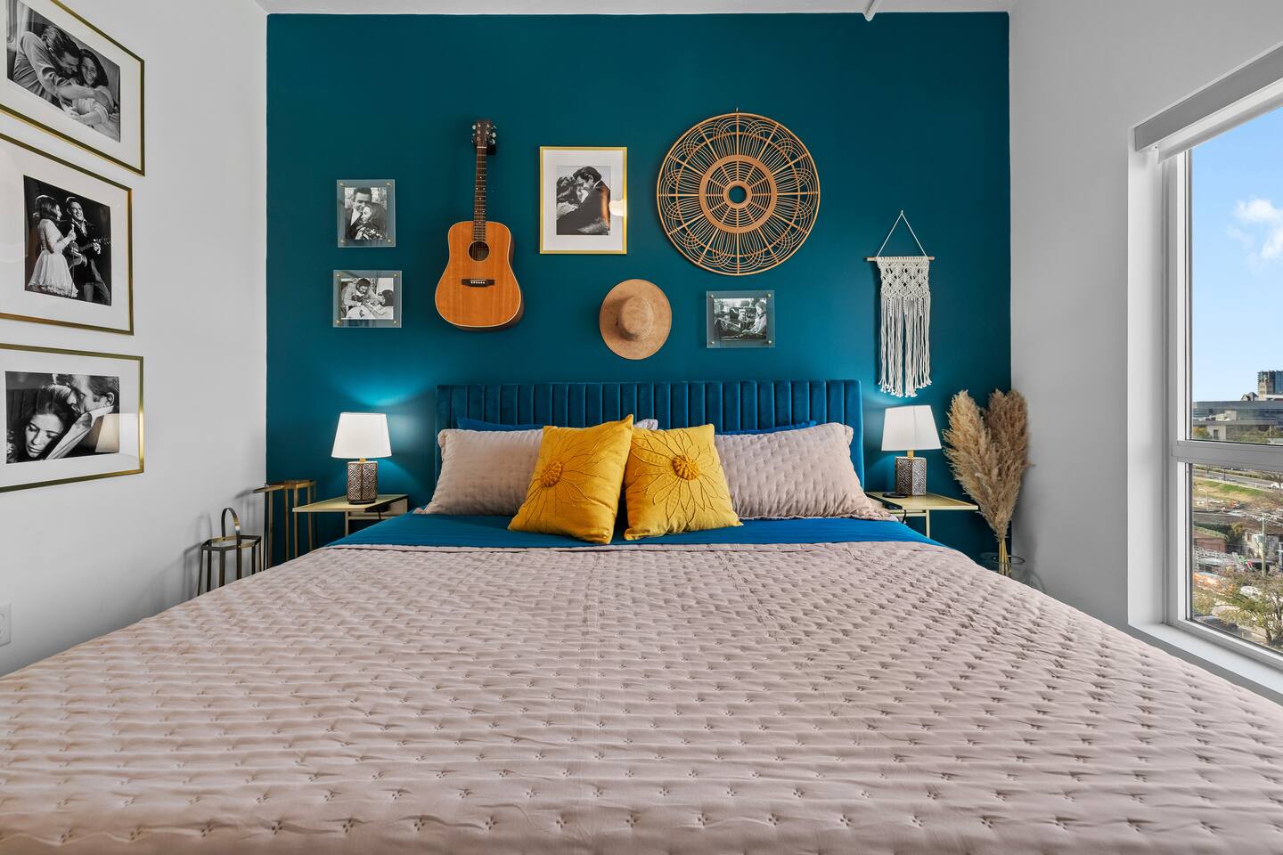 From the moment you walk in, you’ll feel the soul of Cash’s music woven into every detail. The living space features warm textures, rustic-modern accents, vintage touches, and Johnny Cash–inspired décor that sets the tone for your Nashville escape. Spin records on the Victrola, connect to the Marshall Bluetooth speaker, or simply unwind as the city lights glow through the floor-to-ceiling windows.