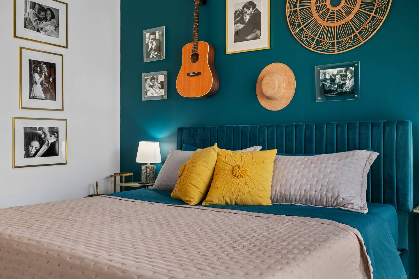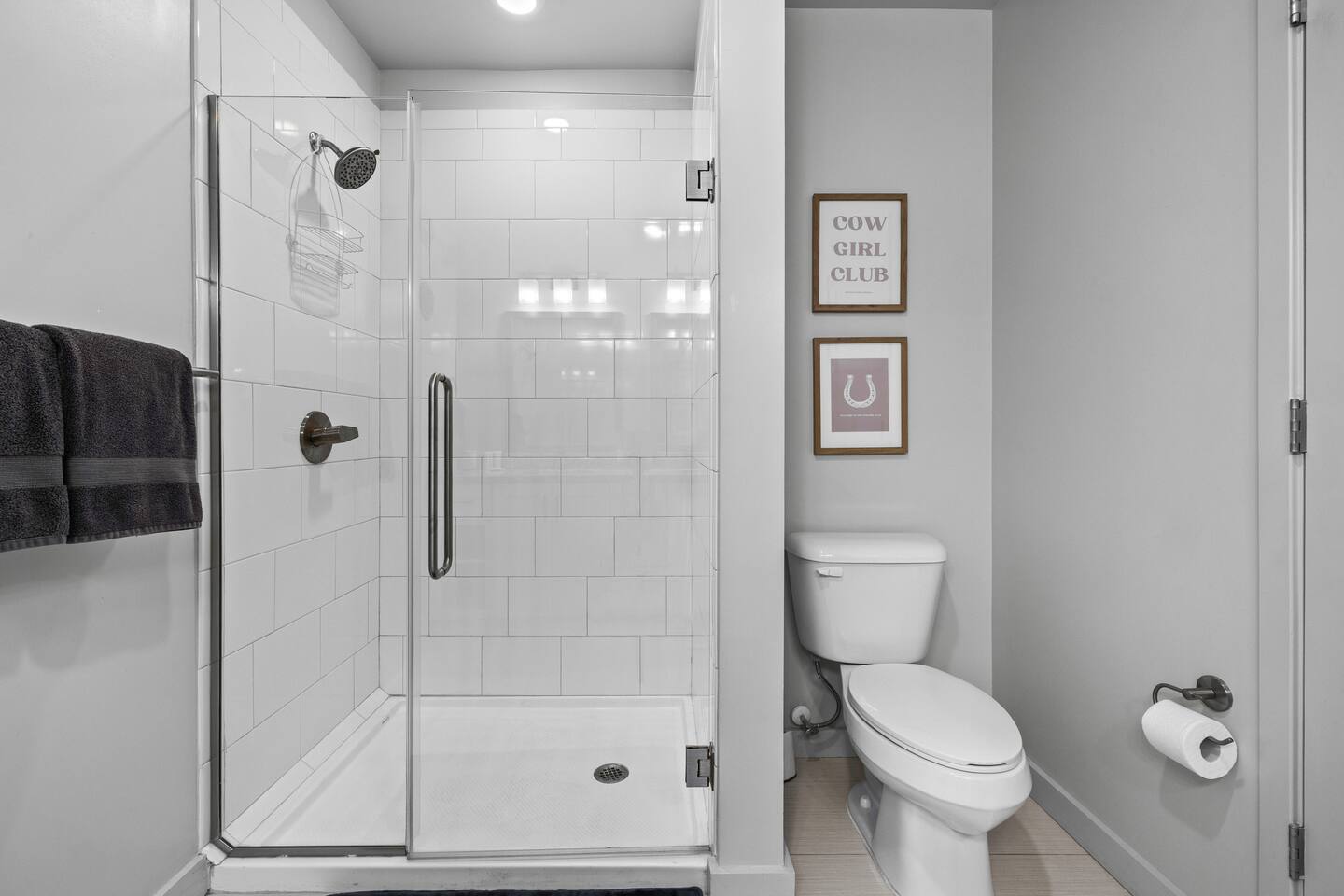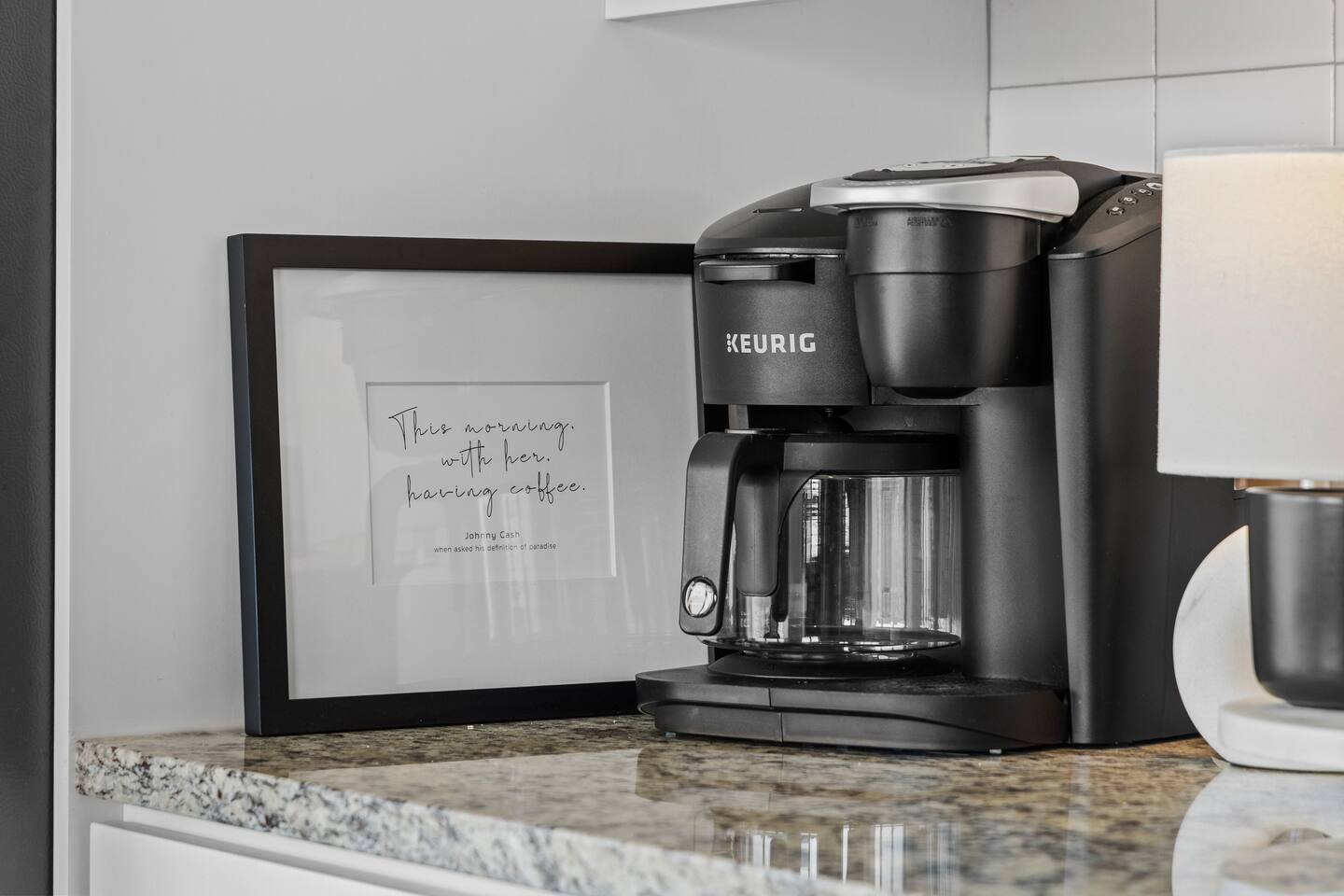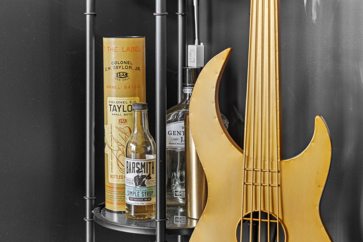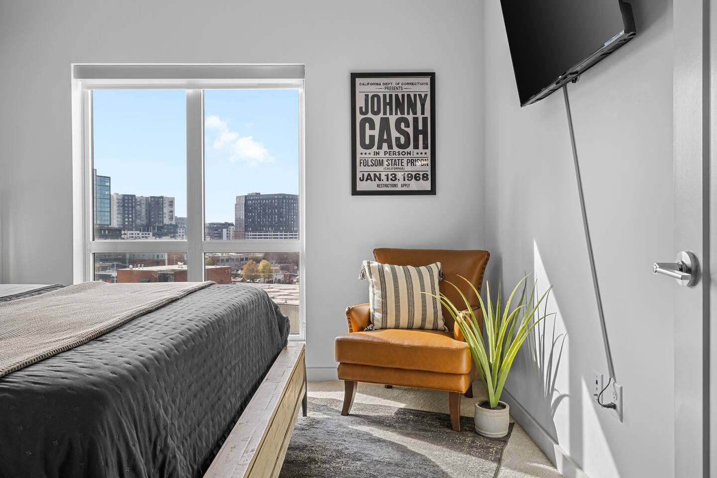 From the moment you walk in, you’ll feel the soul of Cash’s music woven into every detail. The living space features warm textures, rustic-modern accents, vintage touches, and Johnny Cash–inspired décor that sets the tone for your Nashville escape. Spin records on the Victrola, connect to the Marshall Bluetooth speaker, or simply unwind as the city lights glow through the floor-to-ceiling windows.